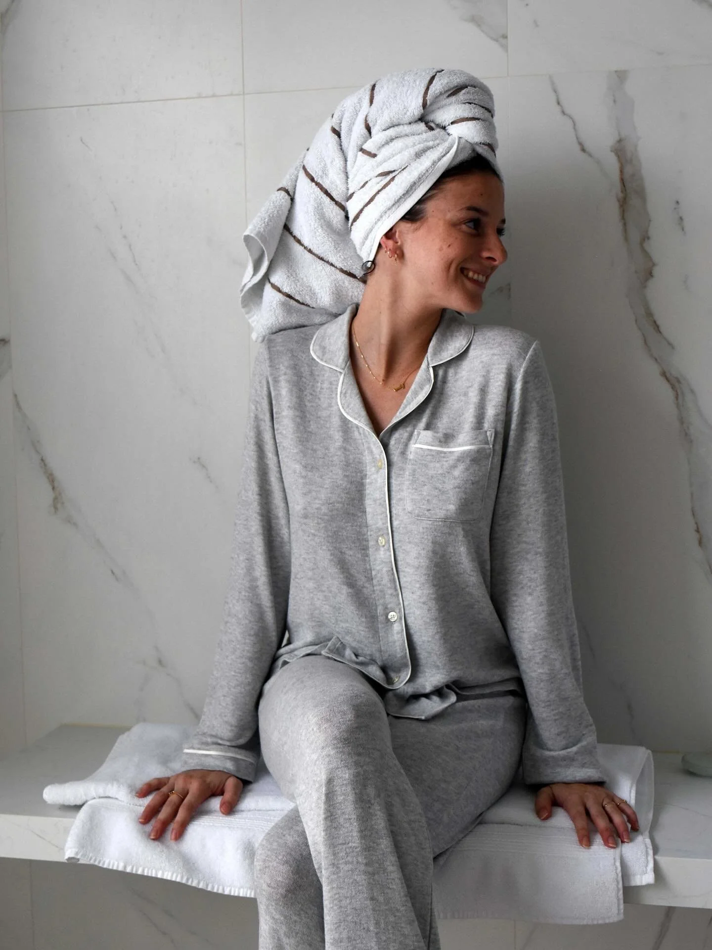 Luxurious, frizz-reducing satin on one side; microfiber towel with waterproof liner on the other side.