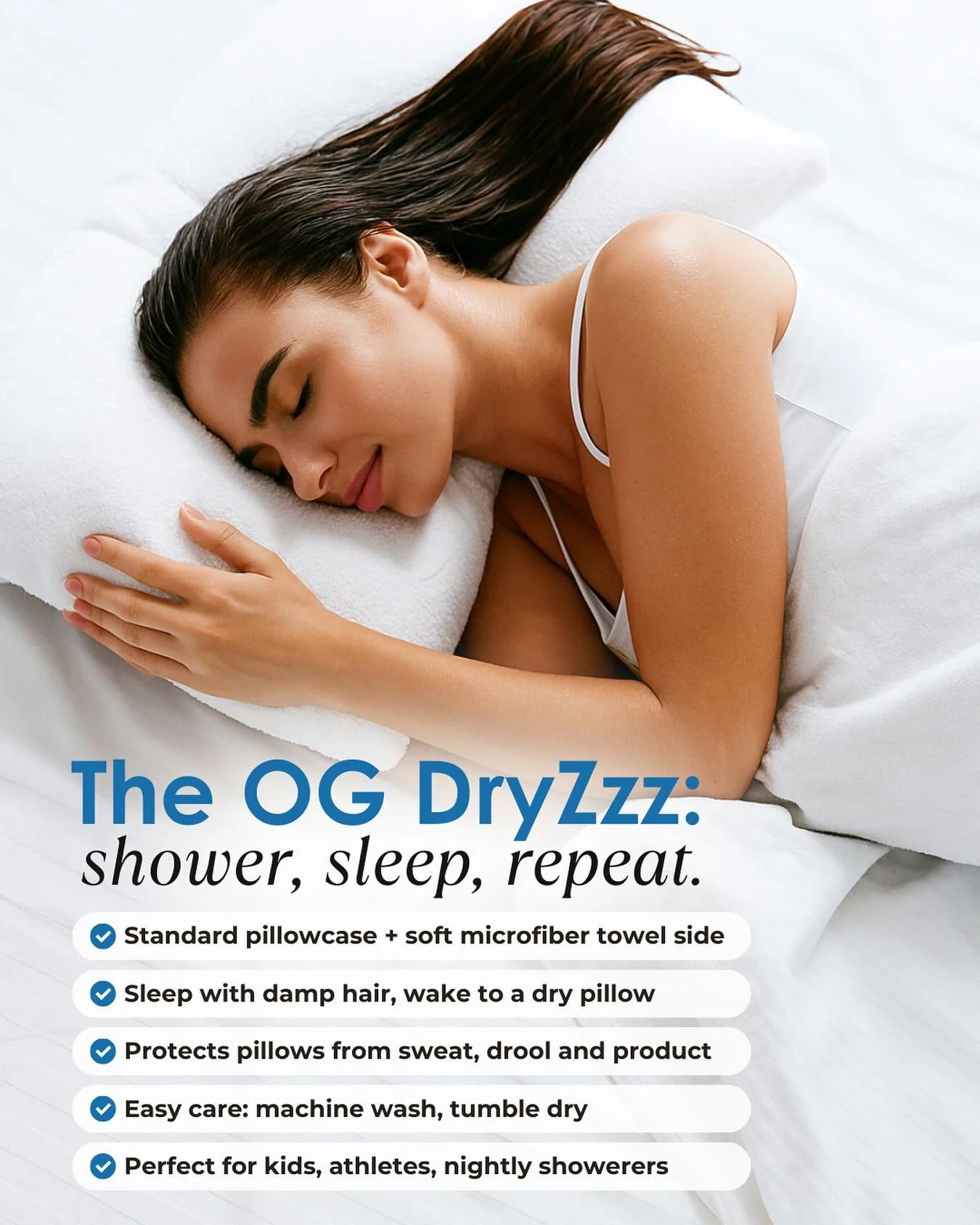 Double the absorbency! Microfiber towel with waterproof liner on BOTH sides of the pillowcase.